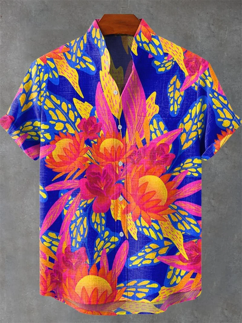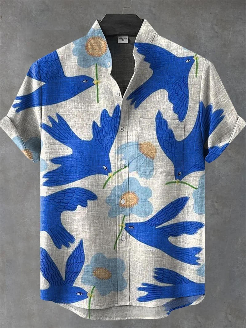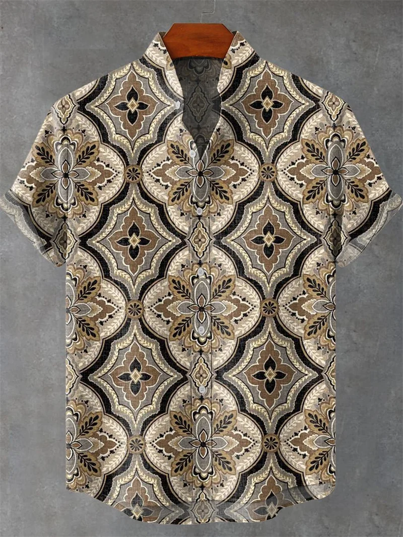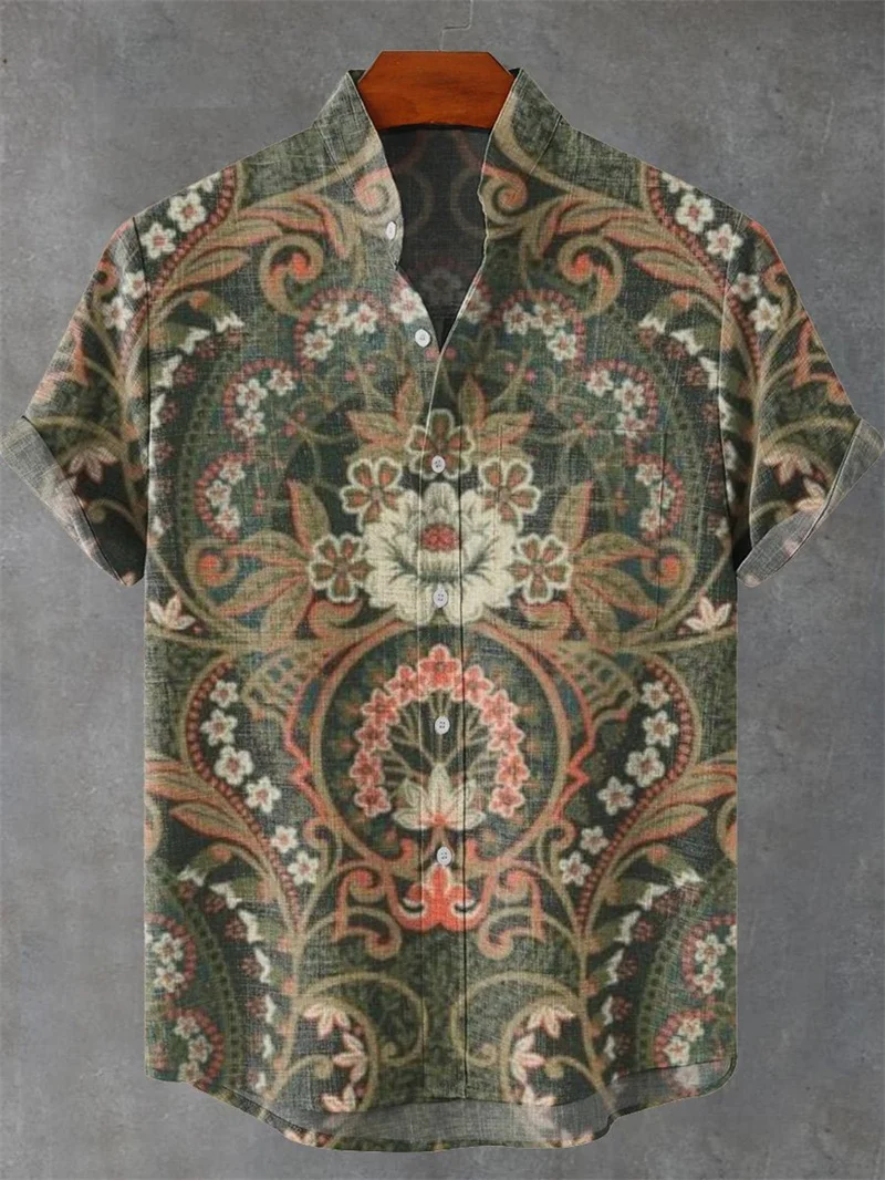 Retro collar men's short sleeved shirt with forest green series print 2025 new casual and comfortable top